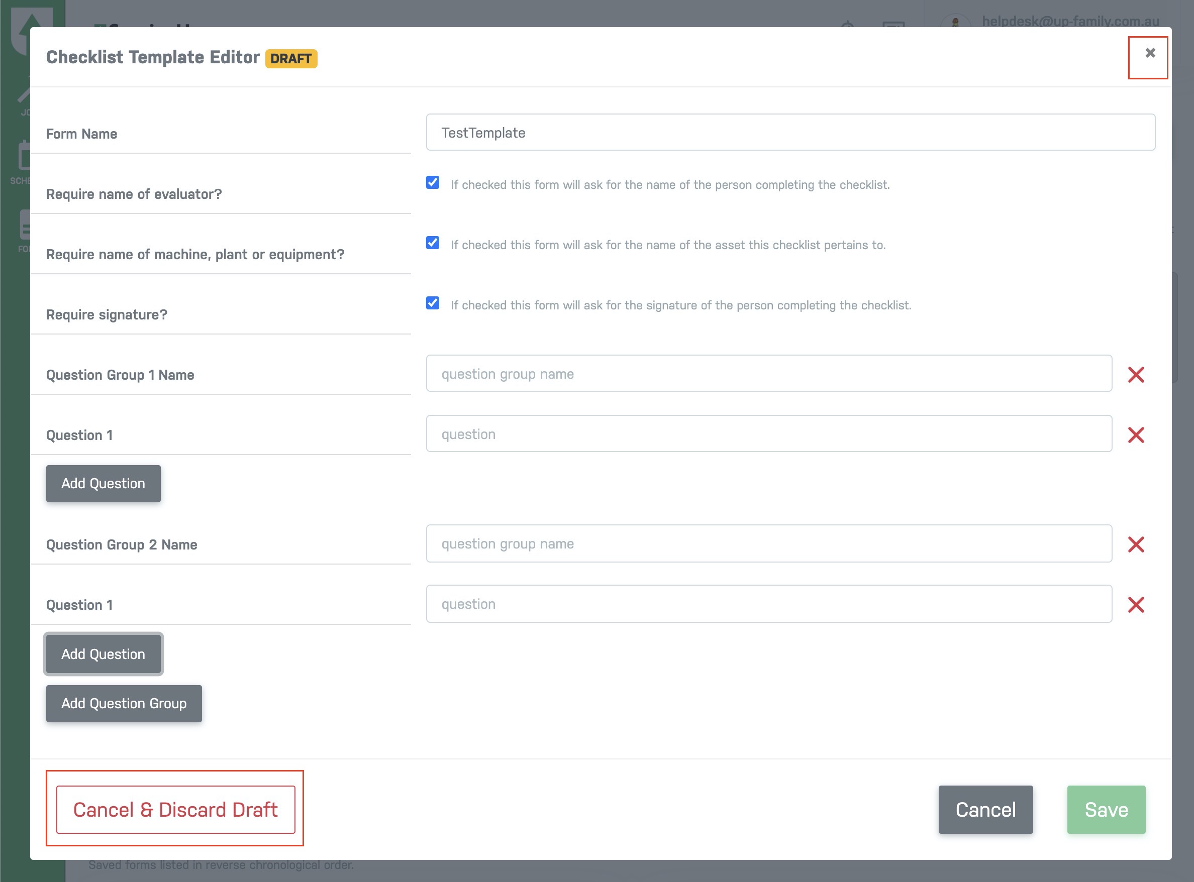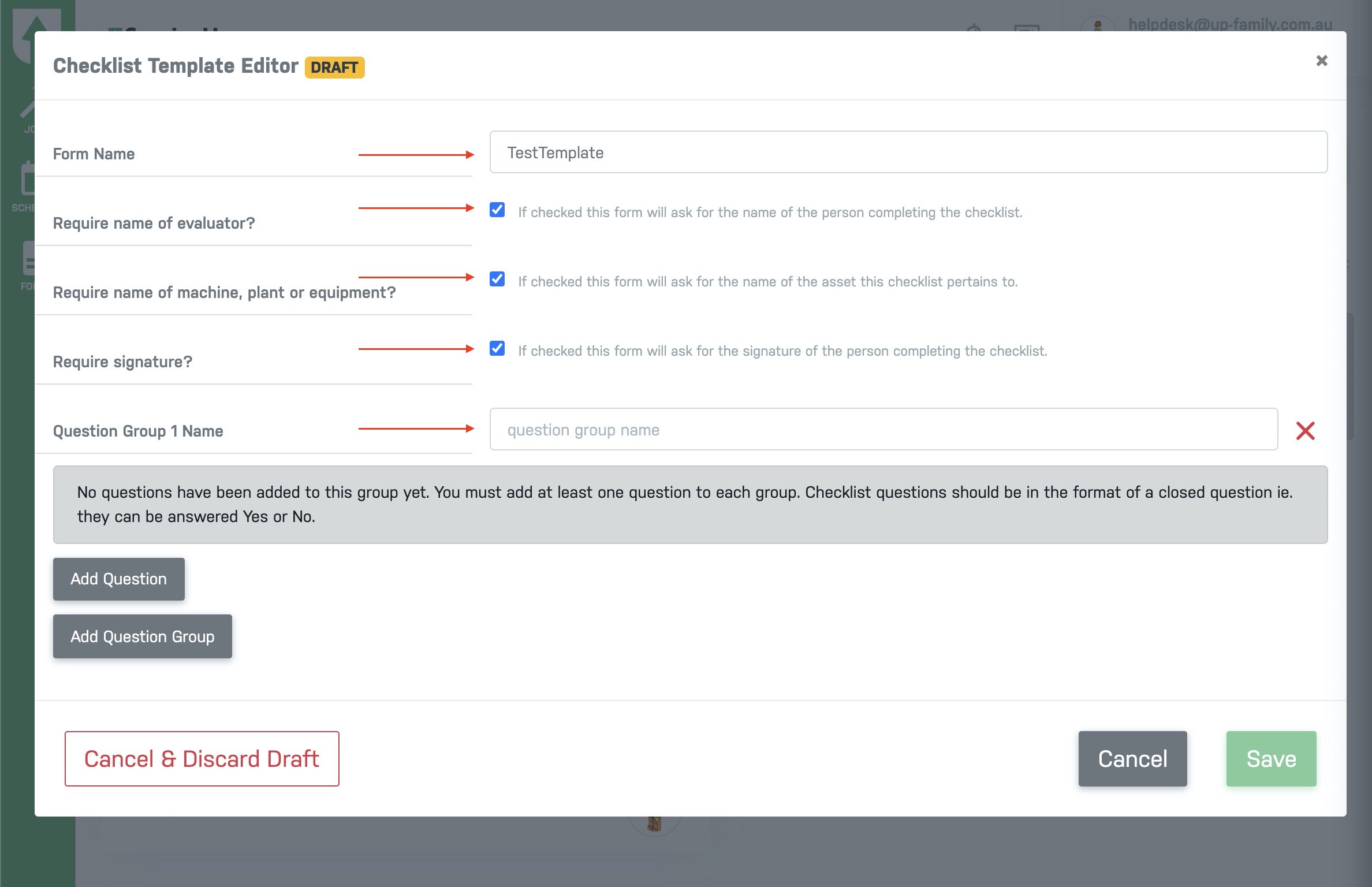 6. Give Form a name, click on the checkboxes where applicable and add questions or a group of questions.