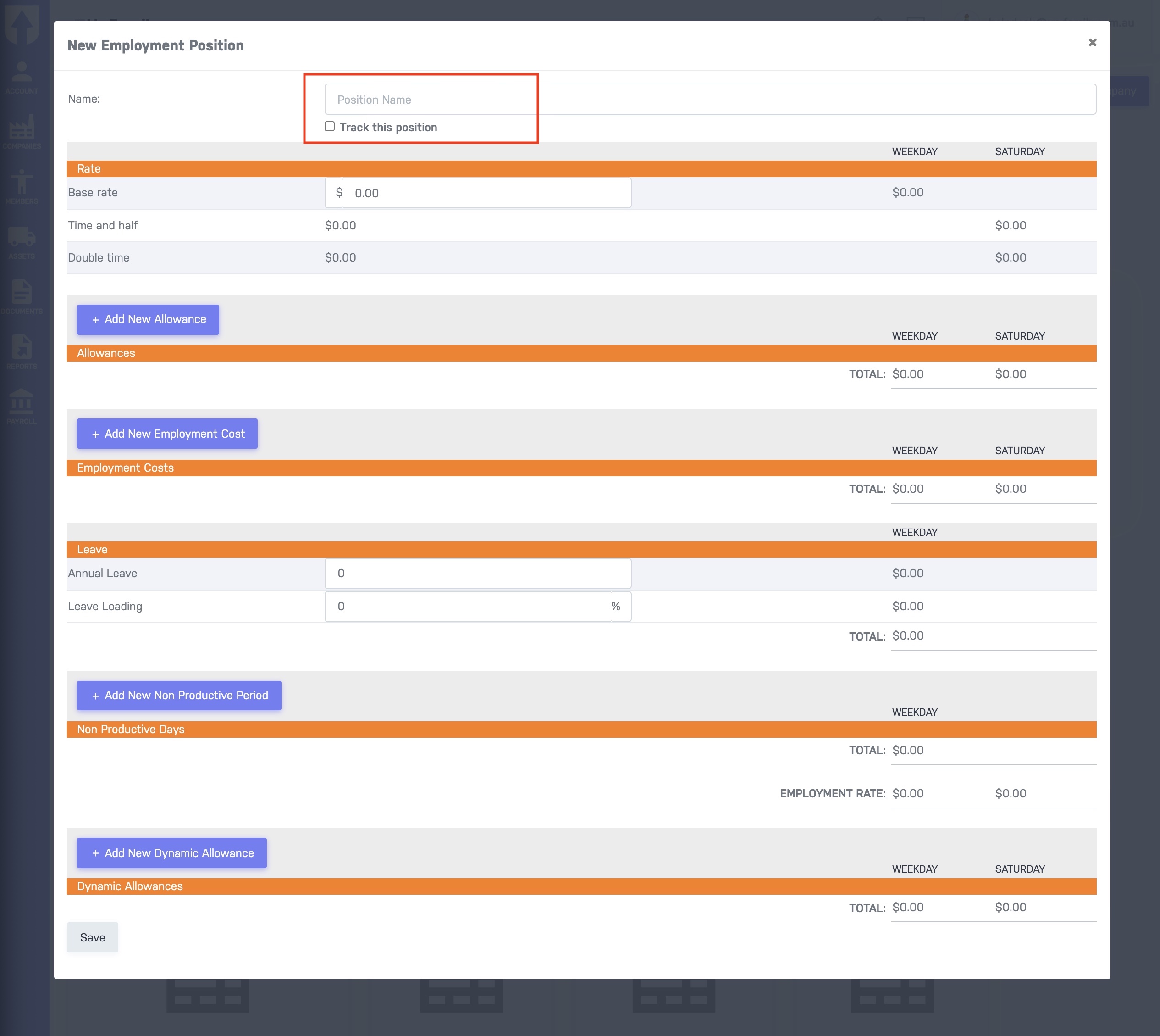 - In New Employment Position form, give a name for the Position and if you want to Track this position, tick the check box.