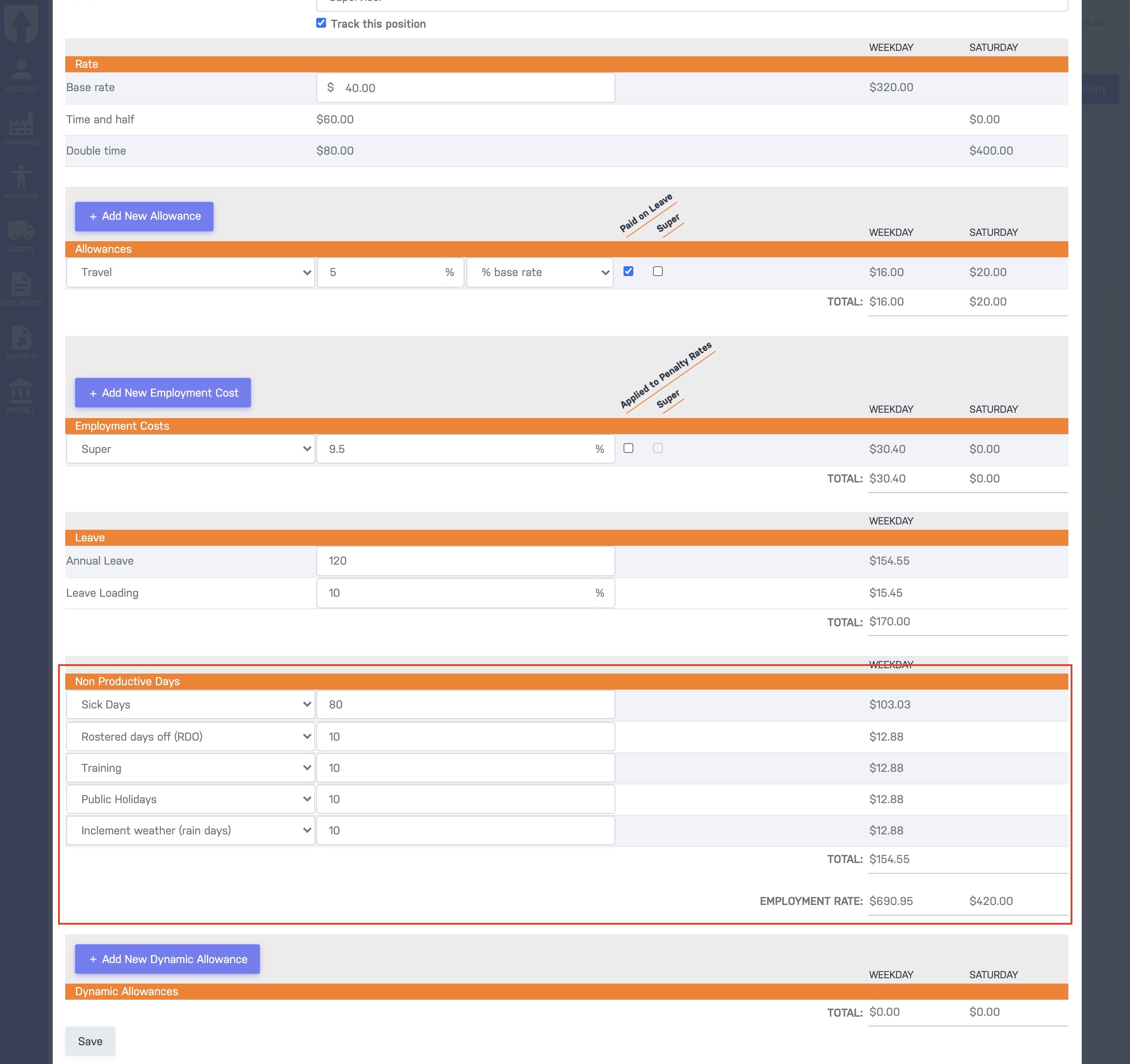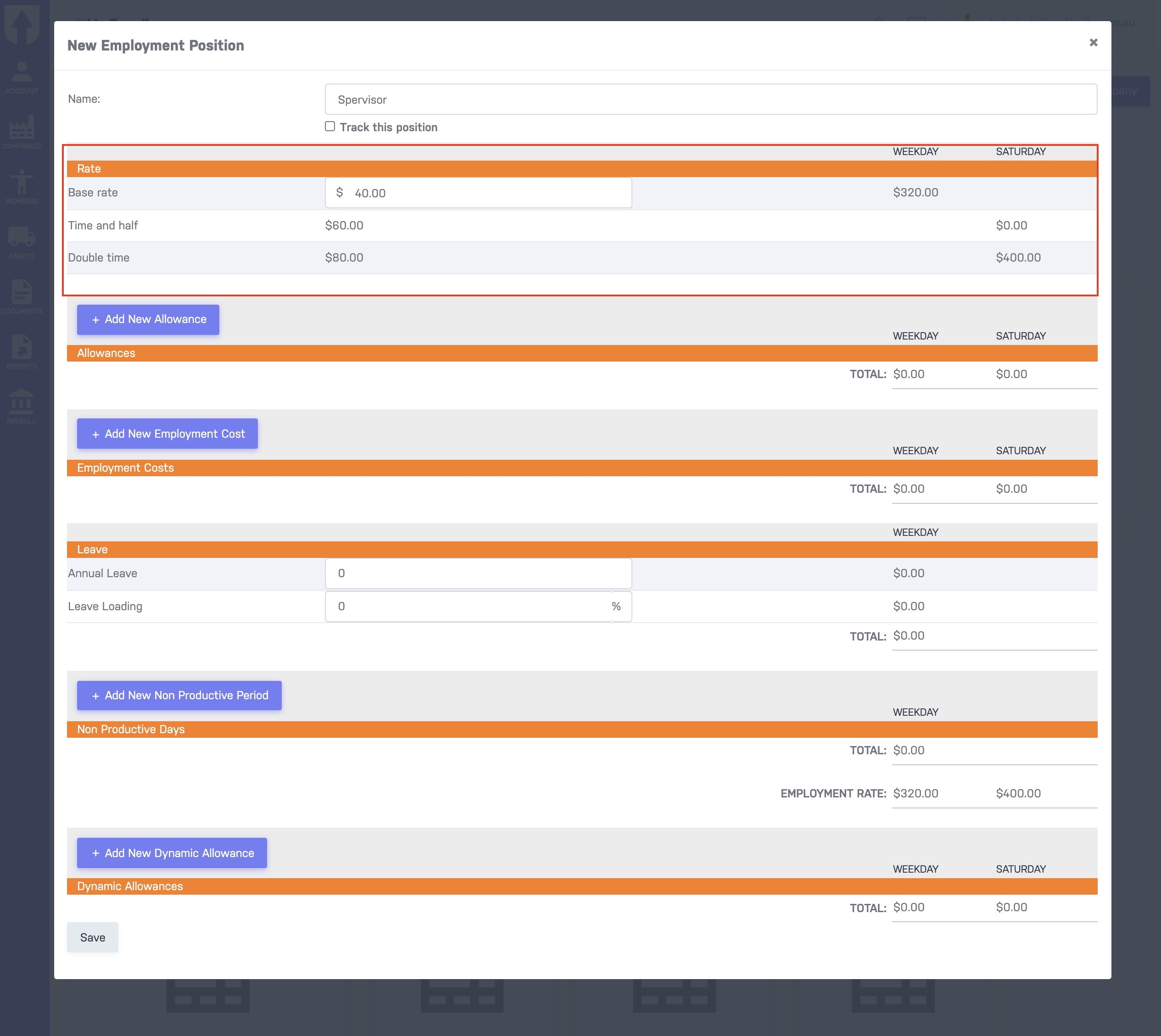 - Next, in Rate section, enter the desired base rate for the position. This will automatically calculate the time and half and double time rate along with Weekday and Weekend cost.