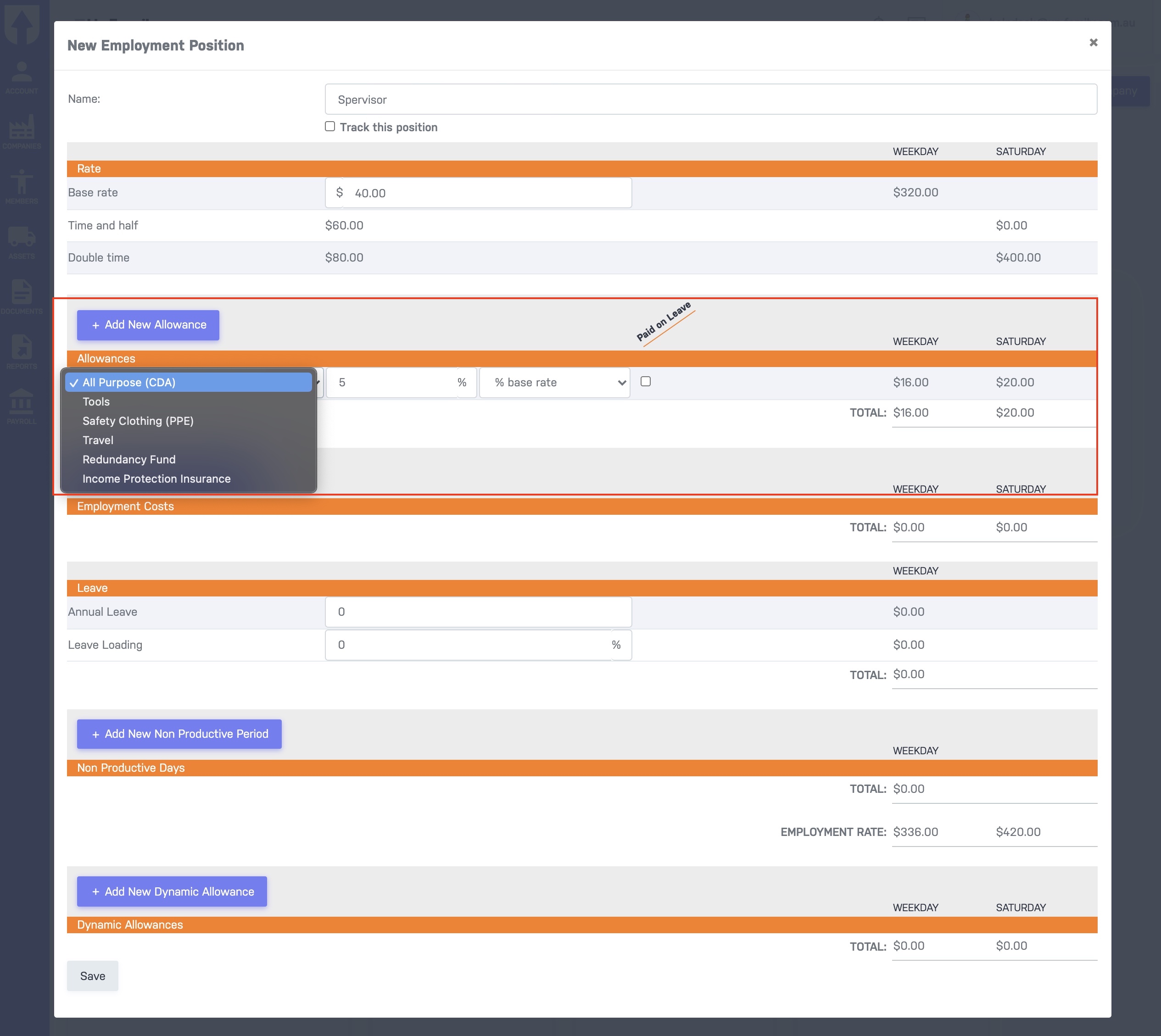 - To add Allowance, click on Add New Allowance button. Here you can select allowance type, allowance percentage and base rate.