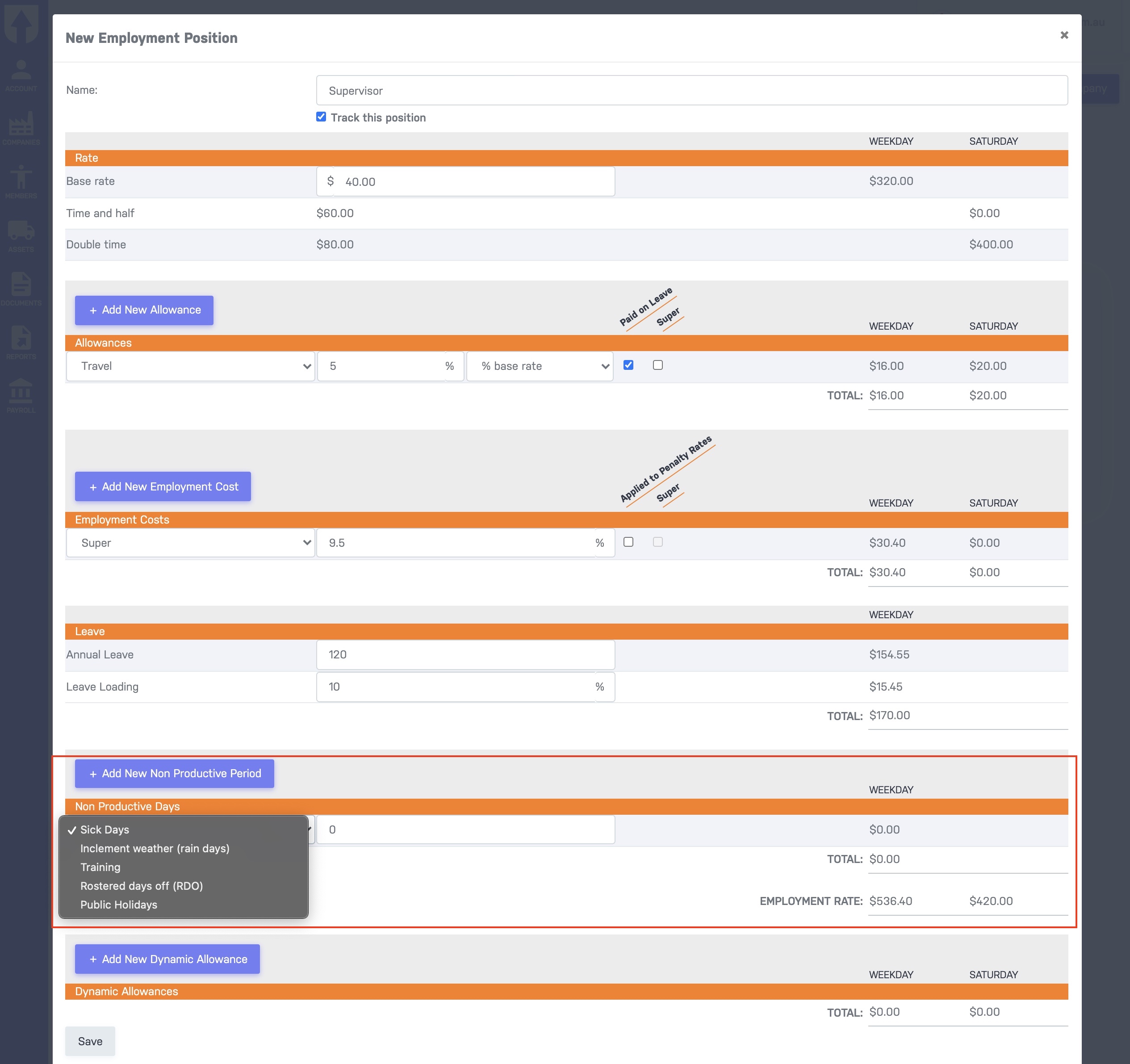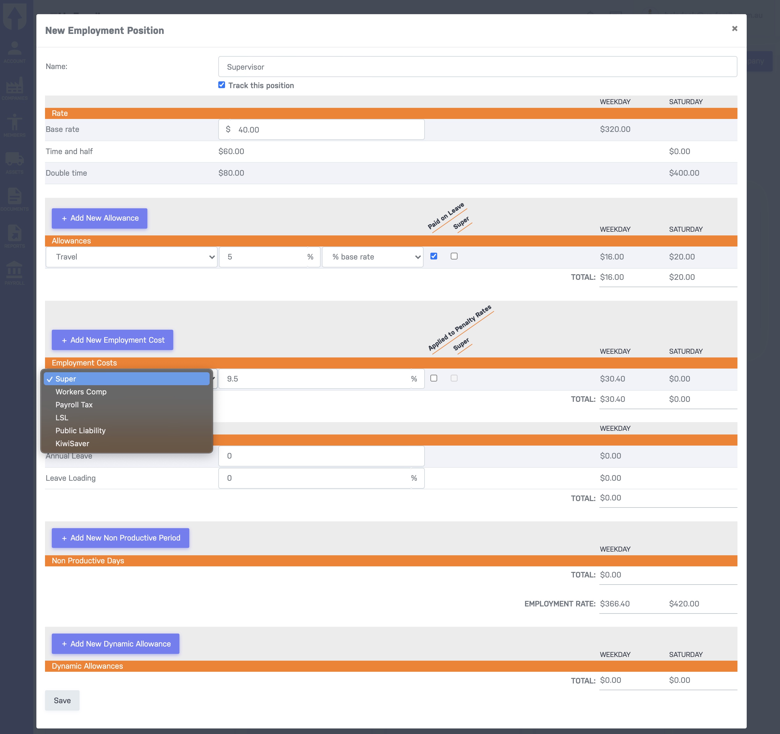 - To Add New Employment Cost, click on this button and choose the options from dropdown, set the percentage and tick the check box if required.