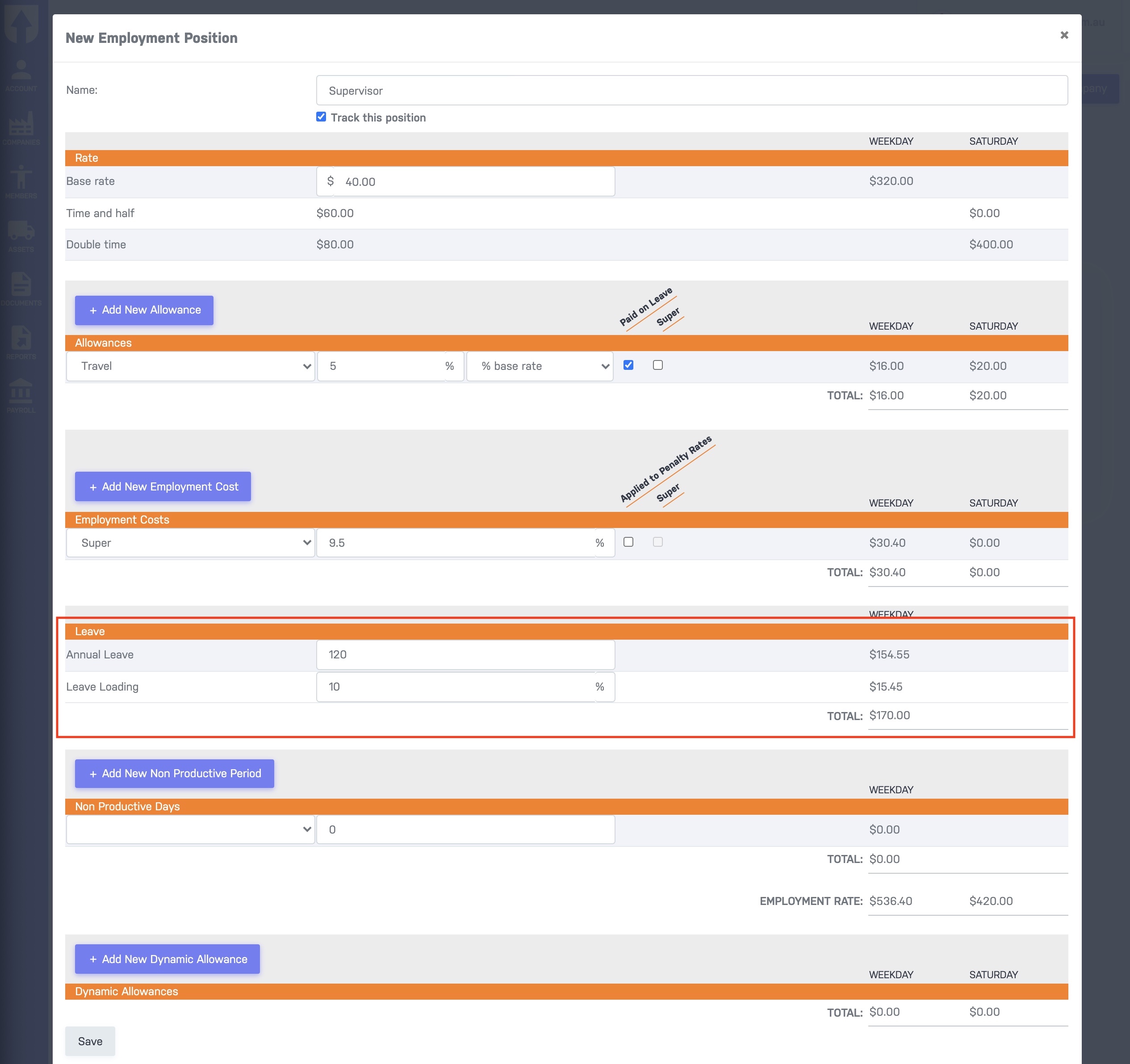 - In Leave section, enter the Annual Leave hours and Leave Loading percentage.