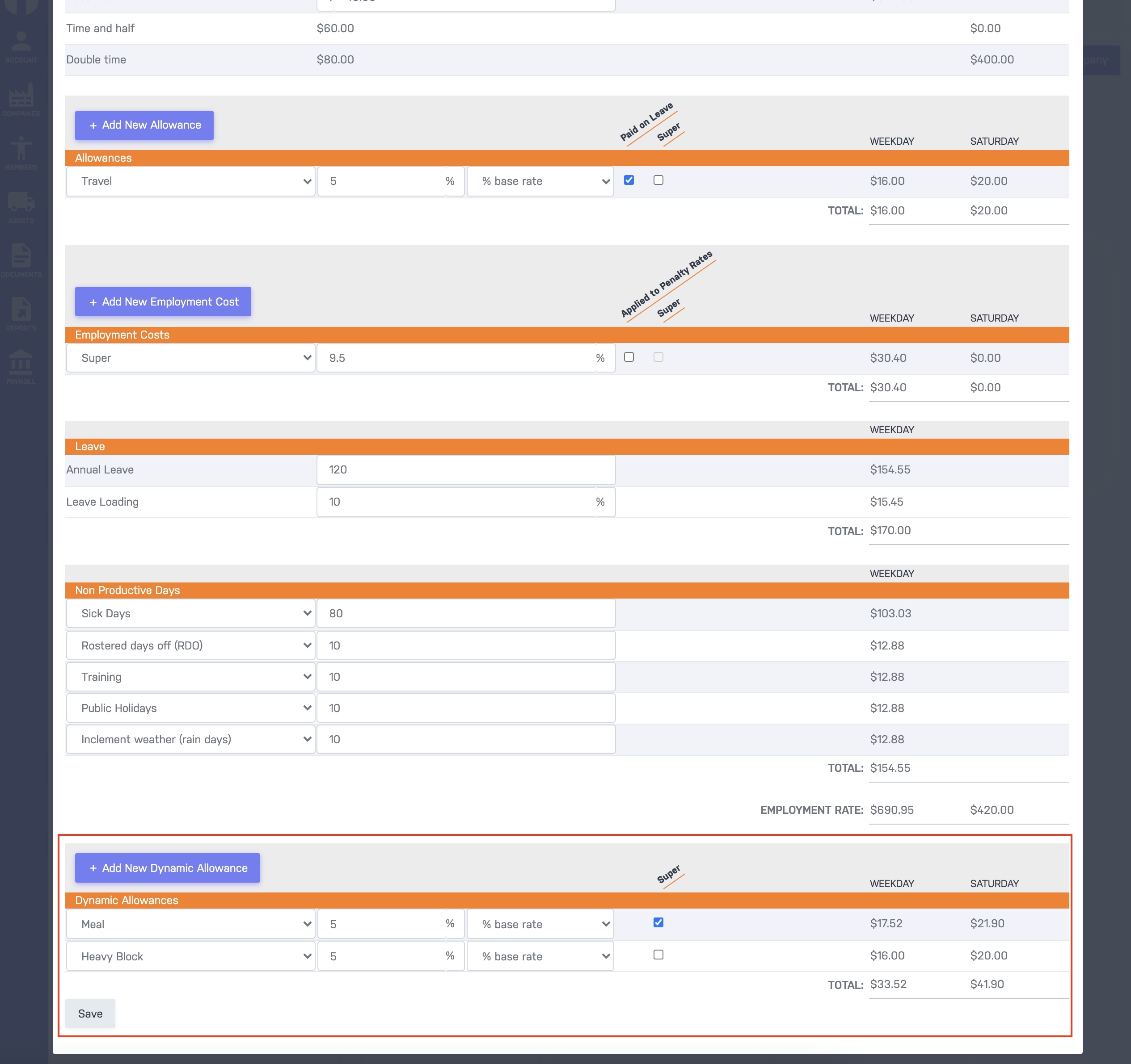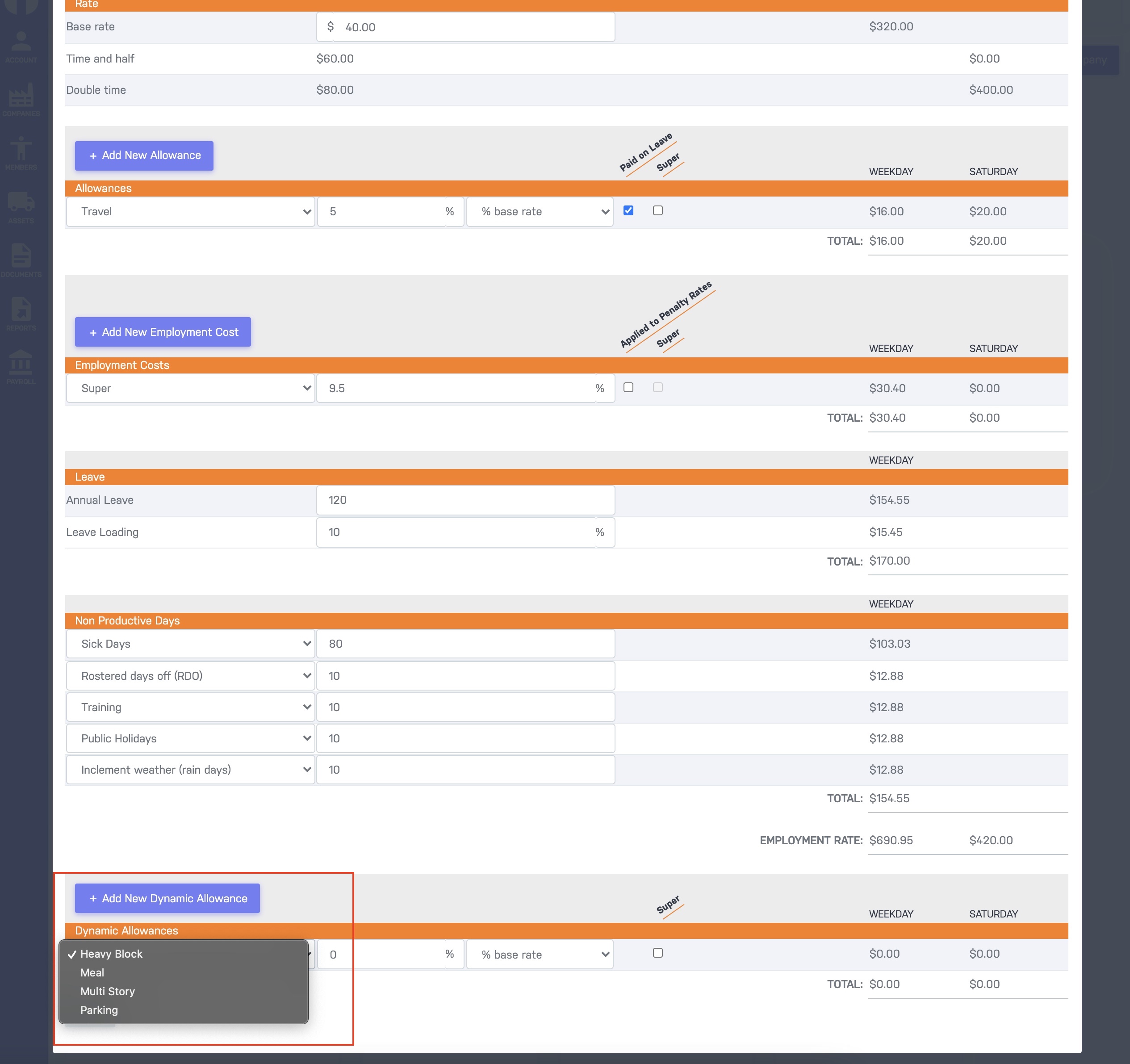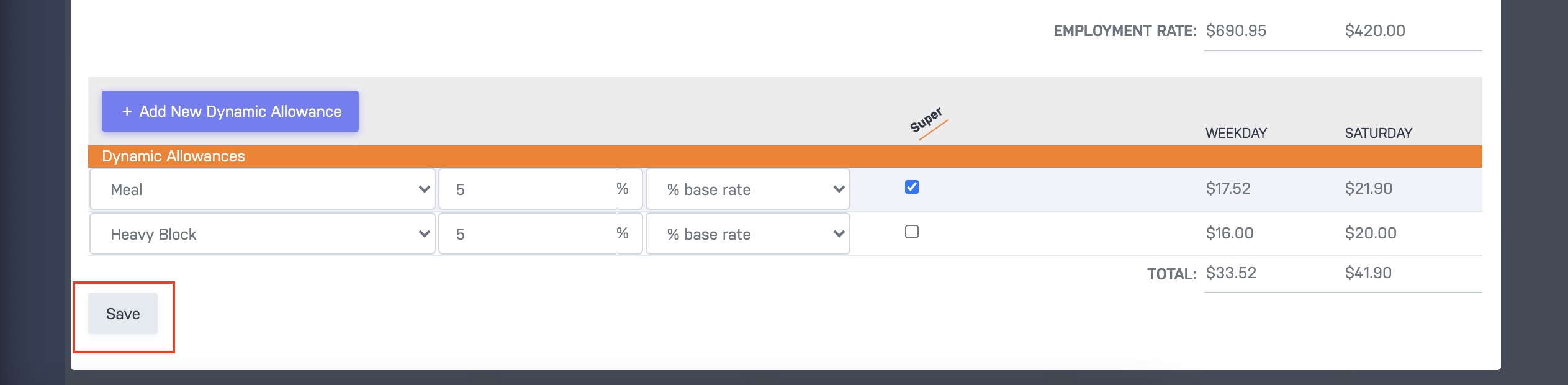 - To add New Dynamic Allowance, select the options from the dropdown and enter the percentage and base rate.